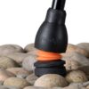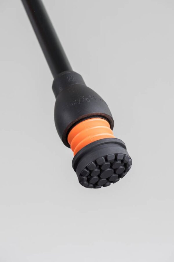 Monteer de Flexyfoot door het ‘bovenstuk’ op de buis van uw kruk te drukken. Vochtig maken met een beetje water en een beetje draaien kan ervoor zorgen dat de Flexyfoot wat makkelijker om de buis past (u heeft hier wel een beetje kracht voor nodig). Zorg voor een strakke pasvorm door de Flexyfoot zover mogelijk op uw hulpmiddel te drukken. De voet moet vrij kunnen draaien zonder dat u deze hoeft los te schroeven. Let op: niet gebruiken als de dop niet stevig vastzit aan de kruk. Het loopvlak kunt u los draaien door eraan te trekken en tegelijktijd draaien, zo kunt u deze ook weer eronder schroeven door de duwen en draaien tot deze vastklikt.