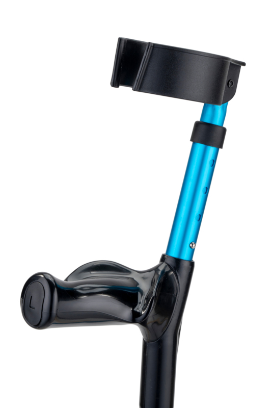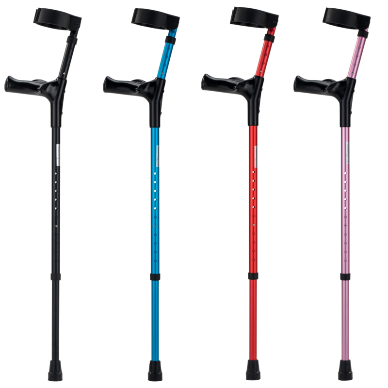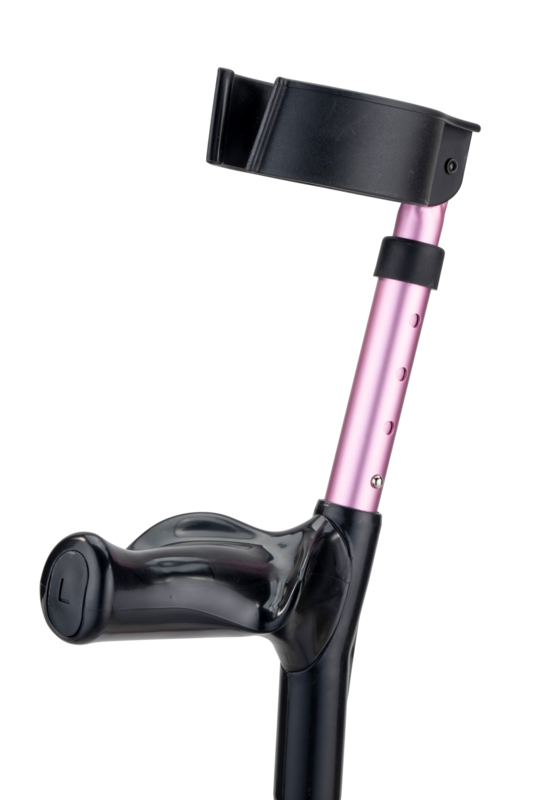 De gekleurde elleboogkrukken met anatomisch gevormde handvatten zijn in 15 stappen in hoogte verstelbaar (het onderste deel in 11 stappen en het bovenste deel in 4 stappen). Met het onderste deel kunt u de hoogte van het handvat instellen en met het bovenste gedeelte kunt u de arm ondersteuning instellen. De verschillende hoogtes van deze elleboogkrukken zijn met een kliksysteem in te stellen.